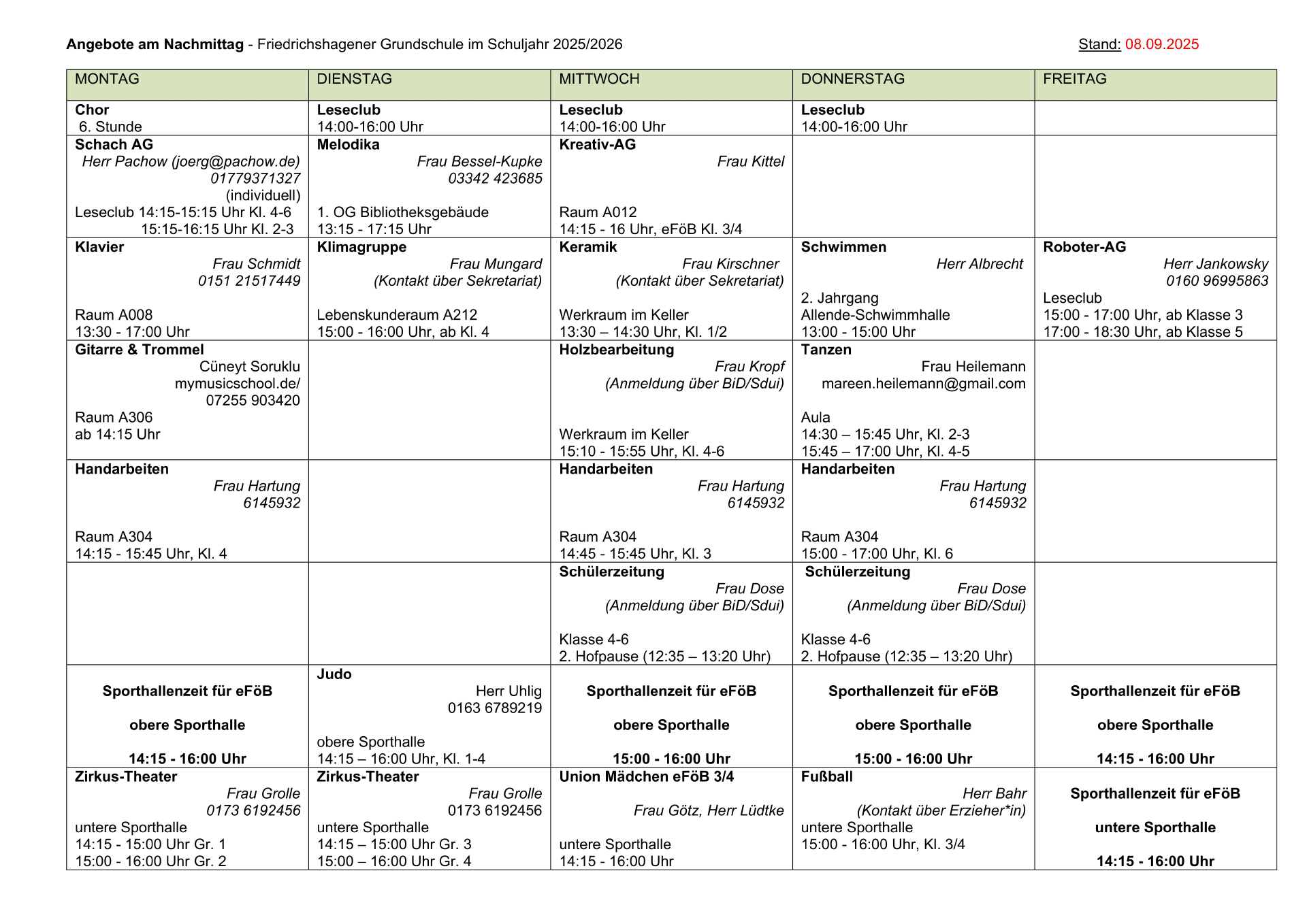 Andere toben sich beim Fußball aus oder lernen, tolle Sachen aus Holz, Ton oder Wolle zu basteln. Einen großen Zuspruch genießt auch unsere Theater-Zirkus-AG, dort können die Kinder die bunte Welt des Zirkus-Theaters erkunden.